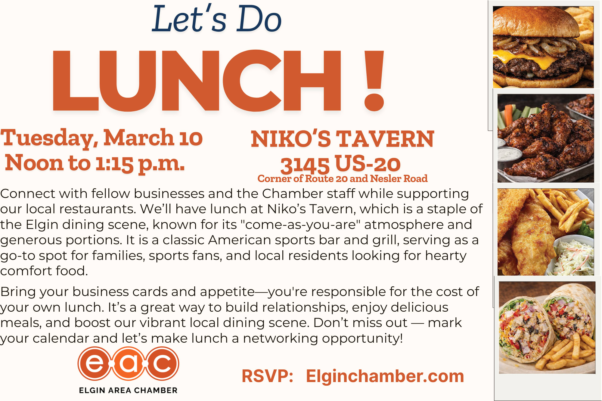 Connect with fellow businesses and the Chamber staff while supporting our local restaurants. We’ll have lunch at Niko’s Tavern, which is a staple of the Elgin dining scene, known for its "come-as-you-are" atmosphere and generous portions. It is a classic American sports bar and grill, serving as a go-to spot for families, sports fans, and local residents looking for hearty comfort food.
