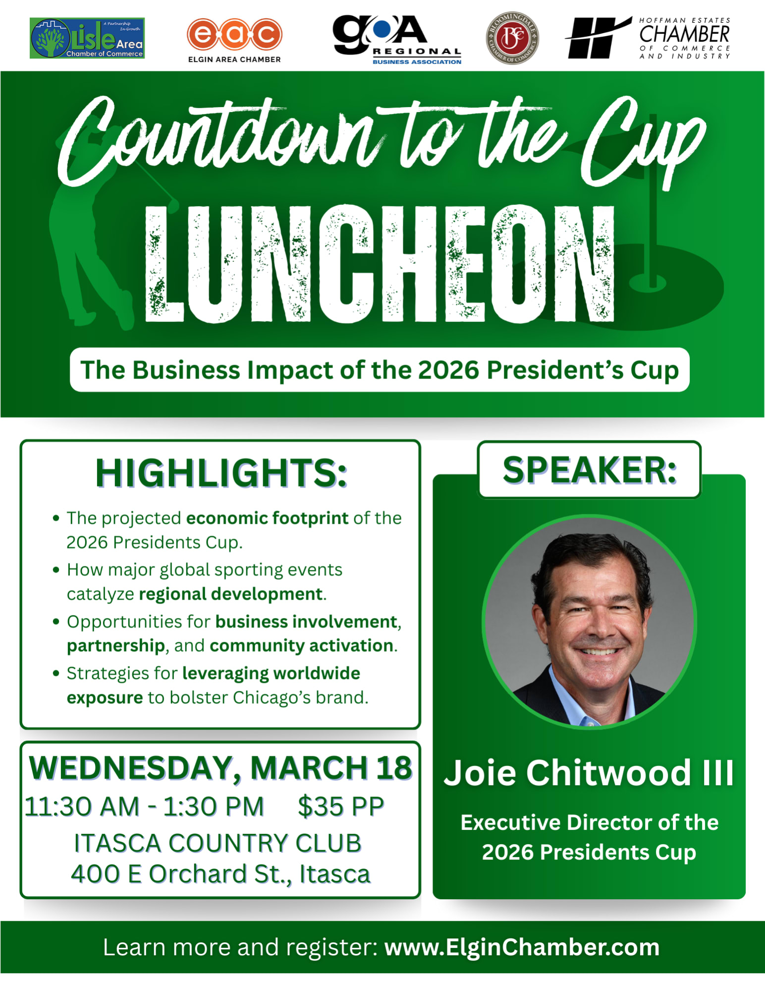 You will hear from Joie Chitwood, Executive Director of the 2026 Presidents Cup. Chitwood will share a behind-the-scenes look at the tournament’s 31-year history, how the Chicago region has become a leading destination for global sporting events, and the charitable and economic impact of this year’s Presidents Cup. General admission tickets are now on sale for this premier international event, and you can learn even more at our Chamber luncheon.