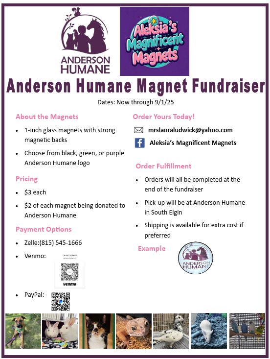 For details, including payment options and QR codes to order your magnet to support Aleksia and Anderson Humane, Click Here: Every magnet sold helps make a difference.