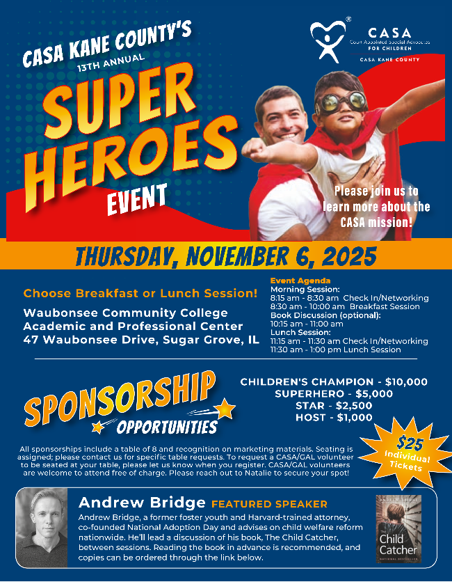 CASA Kane County is excited to host our 13th Annual Super Heroes Event! This event aims to bring the community together to learn more about our mission to advocate for children in foster care.