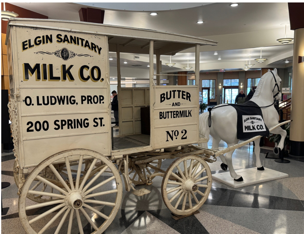 The milk wagon at the Main Library belonged to the Elgin Sanitary Milk Co., later known as Ludwig Dairy.