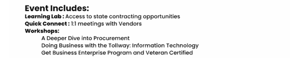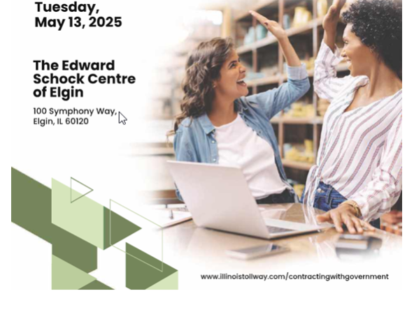 The Illinois Tollway is hosting an event to connect small, diverse and veteran-owned businesses with critical resources and opportunities to grow their goods and services businesses. Learn more. Attendees will have an opportunity to meet, network and learn about upcoming 2025 buying plans, visit the learning lab for registration help, participate in quick connect sessions with IT vendors and learn how to do business with the Tollway and other state agencies. 9 am to 3 pm at The Edward Scock Centre of Elgin 100 Symphony Way, Elgin Workshops will include: How to do Business with the Tollway: Goods and Services – Illinois Tollway Doing Business with the Tollway, a Deeper Dive Into Procurement – Illinois Tollway How to get Business Enterprise Program and Veteran certified – Commission on Equity and Inclusion Navigating BidBuy and Small Business Registration in the Illinois Procurement Gateway – Chief Procurement Office for General Services There will also be a designated space for businesses in the Information Technology sector to learn about the different ways to do business with the Tollway and network with prime IT vendors. |