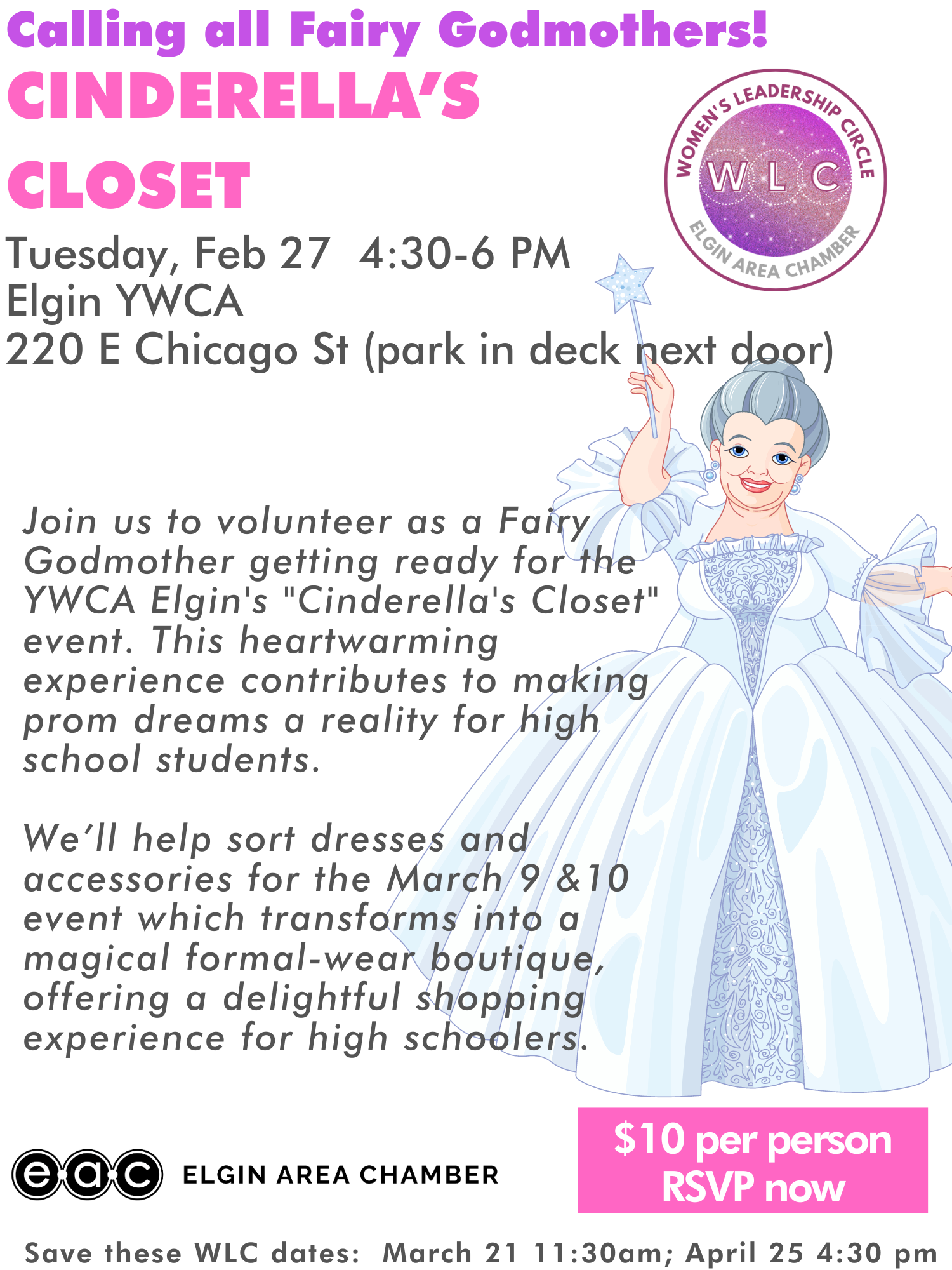 Join us to volunteer as a Fairy Godmother getting ready for the YWCA Elgin's "Cinderella's Closet" event. This heartwarming experience contributes to making prom dreams a reality for high school students. The cost is $10 per person and proceeds will be donated to the YWCA. Register here
