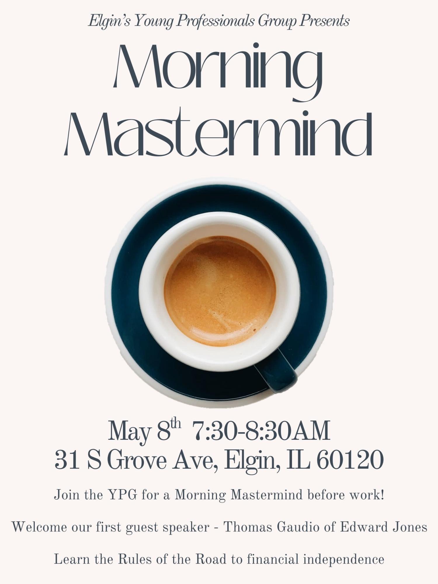 🌅 New! Morning Mastermind Series Start your day with purpose and perspective. Join us for the launch of our Morning Mastermind, a monthly event designed for small-group conversations around leadership, productivity, and career development. 🎙️Featured Guest Speaker: Thomas Gaudio of Edward Jones Topic: Rules of the Road to Financial Independence – Learn key financial strategies and why it pays to start early. 📅 Date: Thursday, May 8 | 7:30 AM – 8:30 AM 📍 Location: Elgin Area Chamber of Commerce. 31 S Grove Ave, Elgin, IL 60120 ☕ Coffee and light breakfast provided!