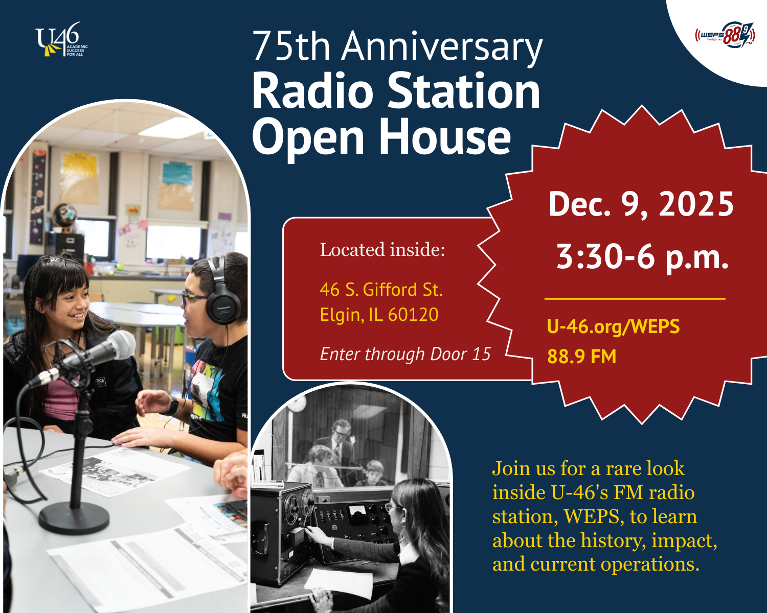 On Tuesday, Dec. 9, from 3:30 to 6 p.m., Elgin Area School District U-46 will host an open house at the district's radio station, WEPS 88.9 FM, in celebration of 75 years of broadcasting. Stop by to learn about the station and its rich history, enjoy some refreshments, and have the opportunity to record a radio station promo!