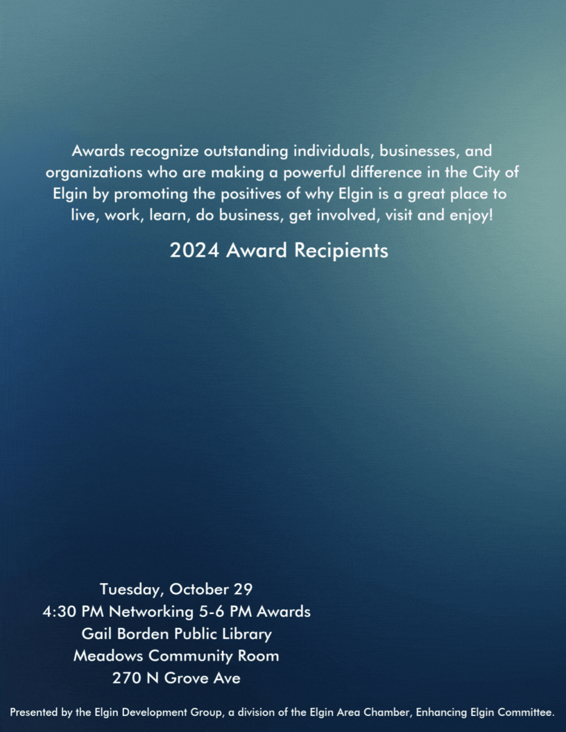 The Enhancing Elgin Committee of the Elgin Development Group is pleased to celebrate the valuable Elgin Image Awards. These awards recognize outstanding individuals, businesses, and organizations who are making a powerful difference in the City of Elgin by promoting the positives of why Elgin is a great place to live, work, learn, do business, get involved, visit and enjoy!