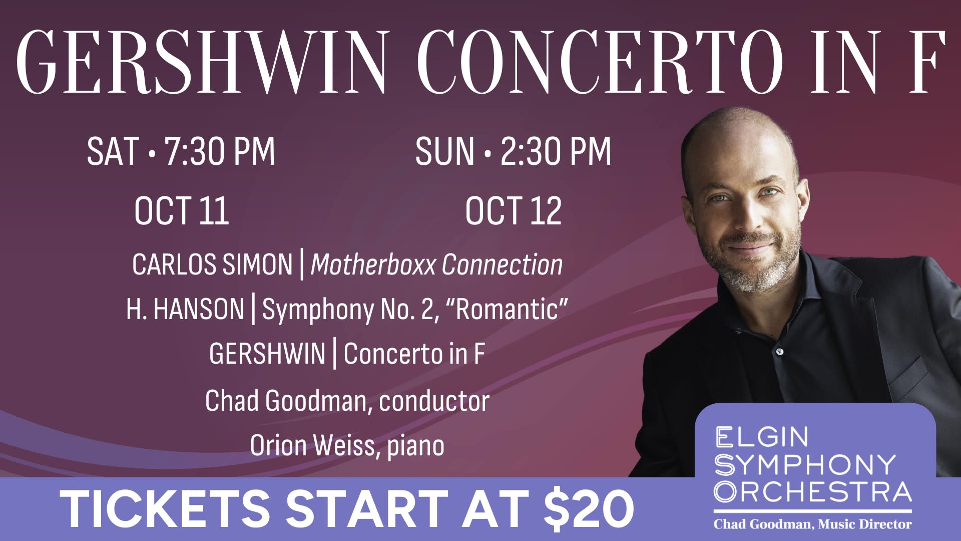 The Elgin Symphony Orchestra begins its 76th Season Classics Series with a vibrant program that spans lush romanticism and bold modern expression. Led by Music Director Chad Goodman, the evening features Carlos Simon’s electrifying "Motherboxx Connection," Howard Hanson’s passionate Symphony No. 2, and George Gershwin’s jazz-influenced Concerto in F, starring acclaimed pianist Orion Weiss. Tickets on sale now: