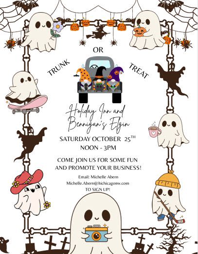 Join us for a Trunk or Treat event at Holiday Inn and Bennigan's in Elgin. Bring the kids by to see all the fun trunks and collect some candy!