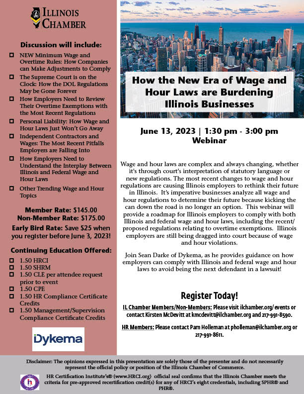 Wage and hour laws are complex and always changing, whether it's through court’s interpretation of statutory language or new regulations. The most recent changes to wage and hour regulations are causing Illinois employers to rethink their future in Illinois. It’s imperative businesses analyze all wage and hour regulations to determine their future because kicking the can down the road is no longer an option. This webinar will provide a roadmap for Illinois employers to comply with both Illinois and federal wage and hour laws, including the recent/proposed regulations relating to overtime exemptions. Illinois employers are still being dragged into court because of wage and hour violations. Join Sean Darke of Dykema, as he provides guidance on how employers can comply with Illinois and federal wage and hour laws to avoid being the next defendant in a lawsuit!