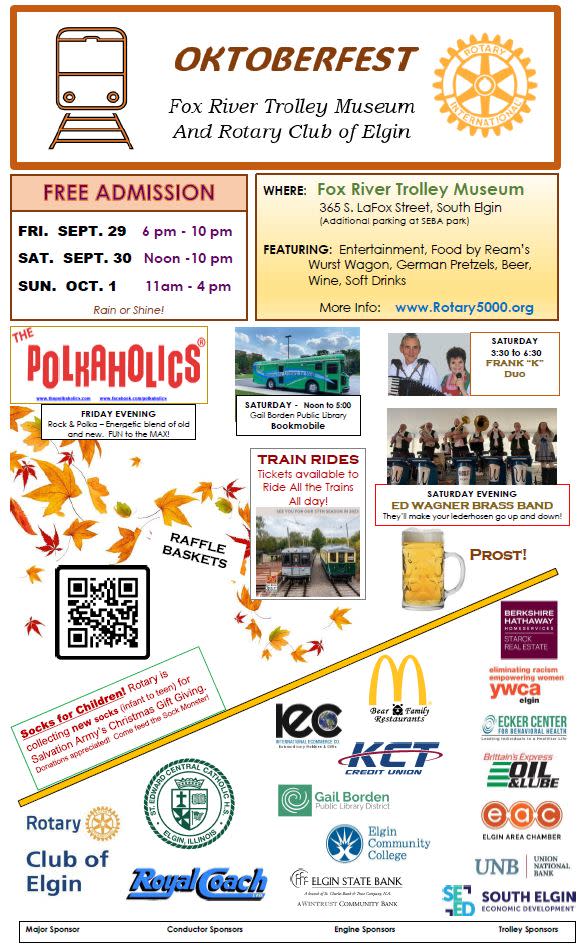 The Elgin Noon Rotary Club and the Fox Valley Trolley Museum present Oktoberfest in South Elgin on Friday, Sept. 29 from 6 to 10 pm, Saturday, Sept. 30 from noon to 10 pm and Sunday, October 1 from 11 am to 4 pm.