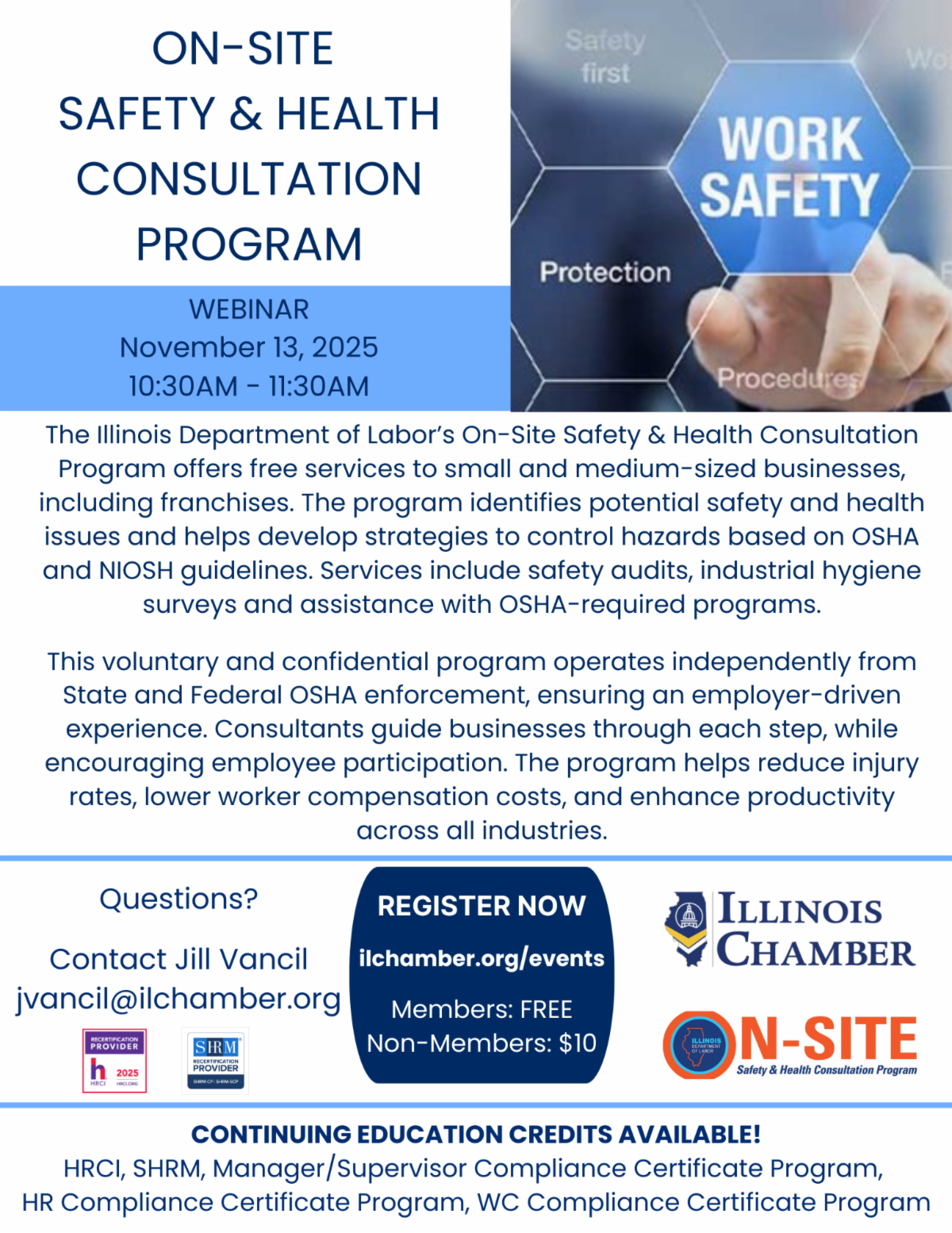The Illinois Department of Labor offers a free On-Site Safety & Health Consultation Program for small and medium-sized businesses, including franchises. Registration: