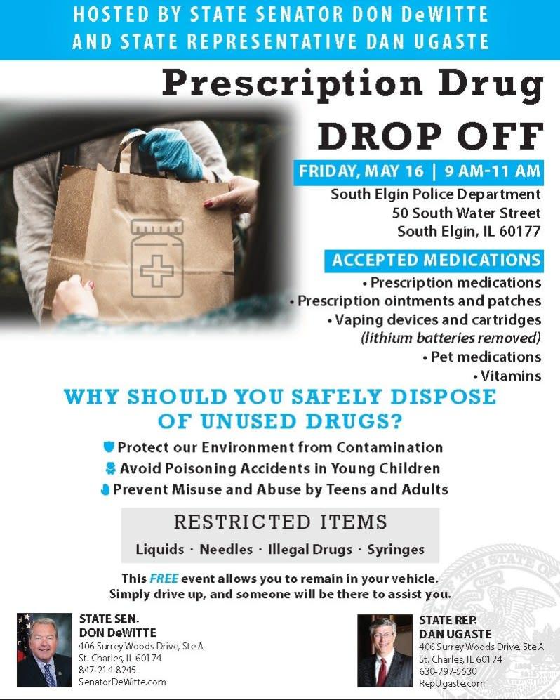 South Elgin's Public Safety Center (50 S Water Street) will serve as the site for a Prescription Drug Drop-Off event hosted by State Senator Don DeWitte and State Representative Dan Ugaste. It takes place Friday, May 16 from 9-11am, and is an easy drop off for Rx meds, ointments and patches, pet medications, vitamins and more. The drop off event keeps medications from getting flushed into our waterways, and misused by children, teens or adults. Thank you, #SouthElgin!