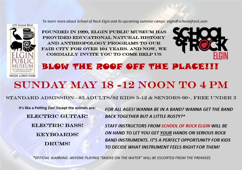 On May 18th, we partner with the newly-opened School of Rock Elgin AT THE MUSEUM, to allow all ages to try out rock band instruments. This is a great opportunity for kids to get a feel for what they'd like to learn. Details: