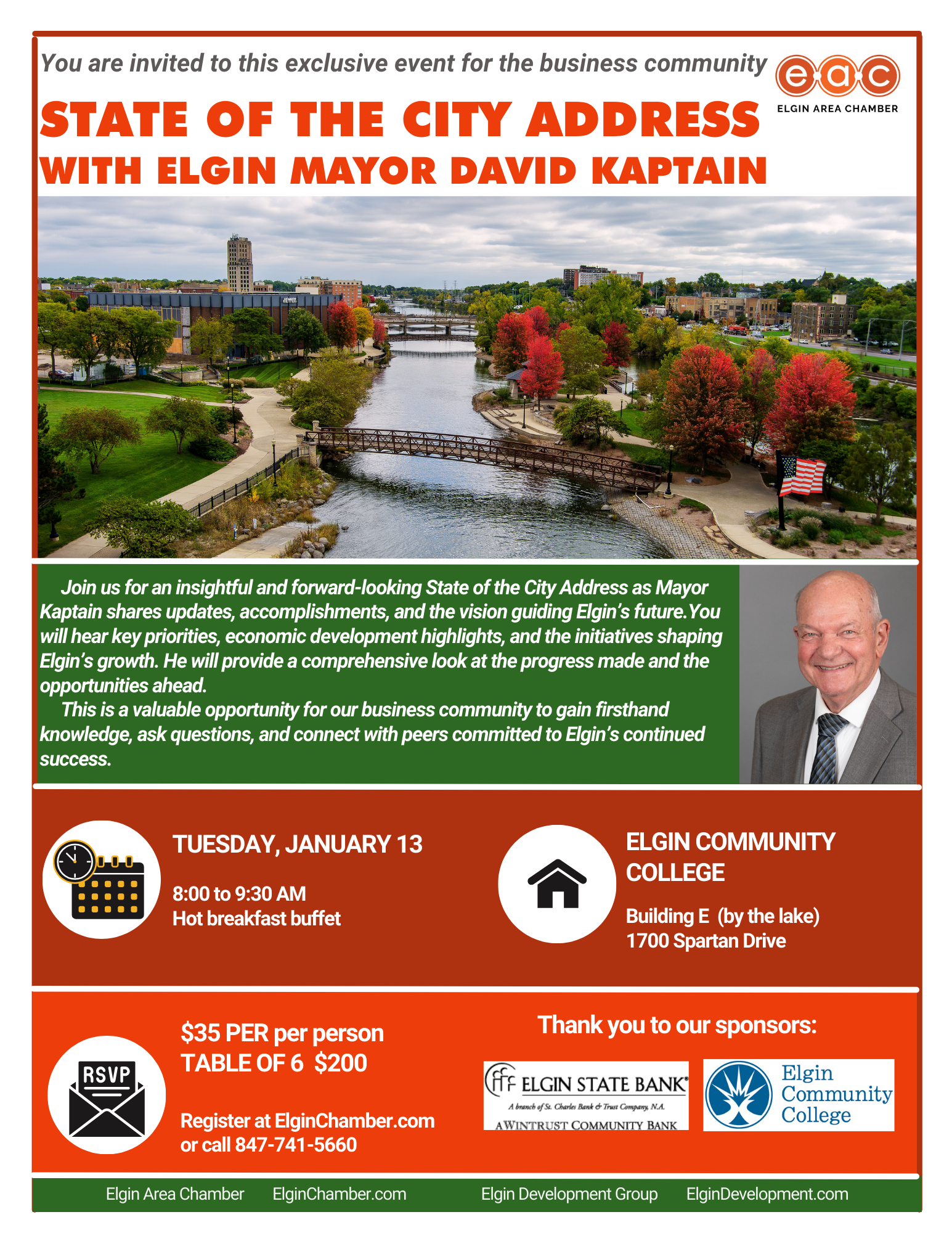 Please join us for Mayor Kaptain's Annual "State of the City" Address to the Elgin Area Chamber on Wednesday, January 13, at 8:00 a.m. In this exclusive event for the business community, Mayor David Kaptain will celebrate Elgin's achievements while planting seeds for the future. Our event is a not-to-be-missed opportunity to sit down to breakfast with the Mayor, including a Q&A session and networking.
