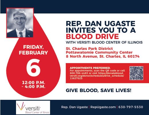 State Rep. Dan Ugaste invites you to a blood drive with Versiti Blood Center of Illinois! Your contribution could mean the world to someone in need. Appointments are preferred. To schedule please visit https://donateblood.versiti.org/donor/schedules/drive_schedule/11627525 or scan the QR code below.