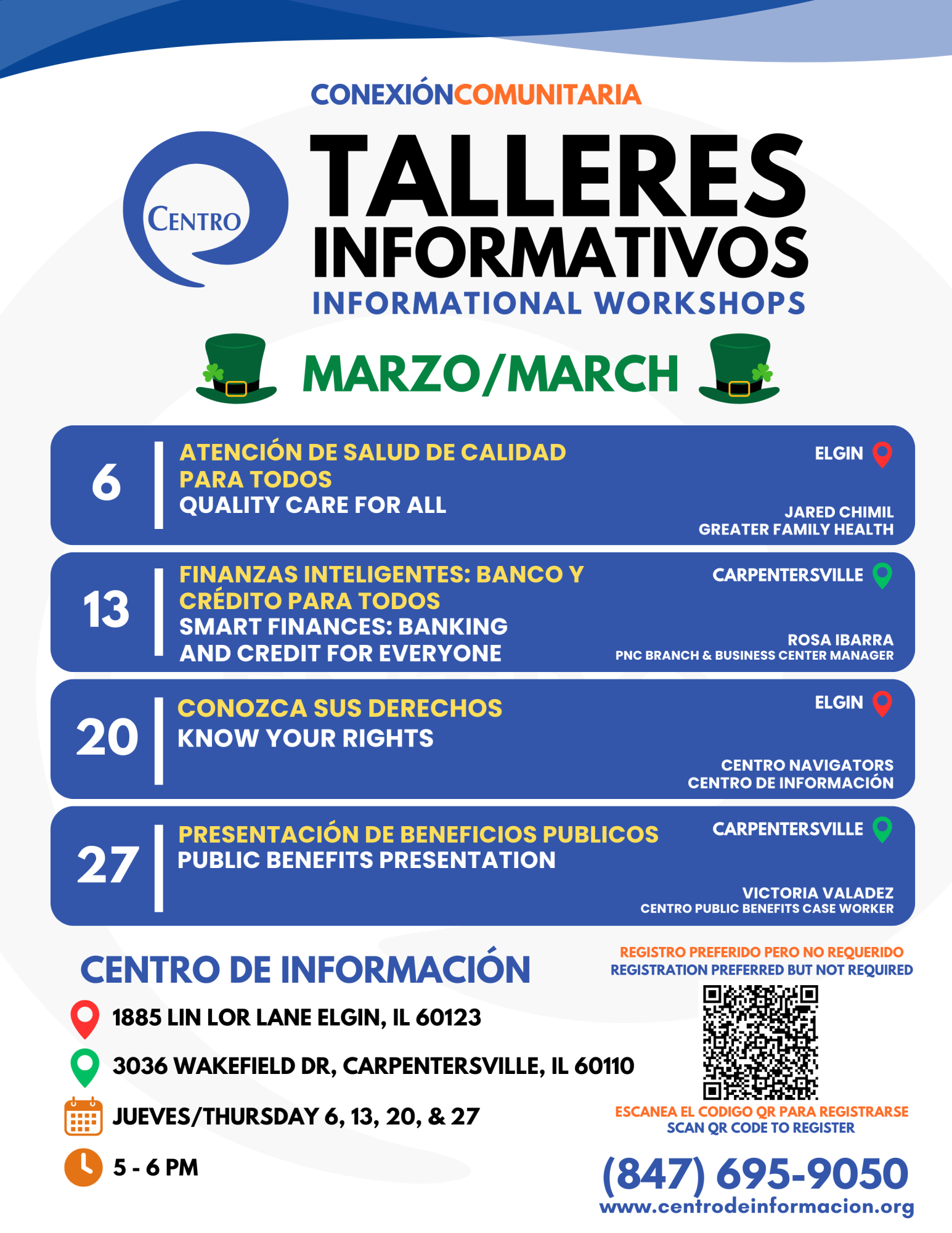 Cada semana organizamos presentaciones de diversas organizaciones sobre temas que benefician a la comunidad. Estos talleres están aquí para apoyarte a ti y a tu familia. Todos son bienvenidos. Detalles Y Registro