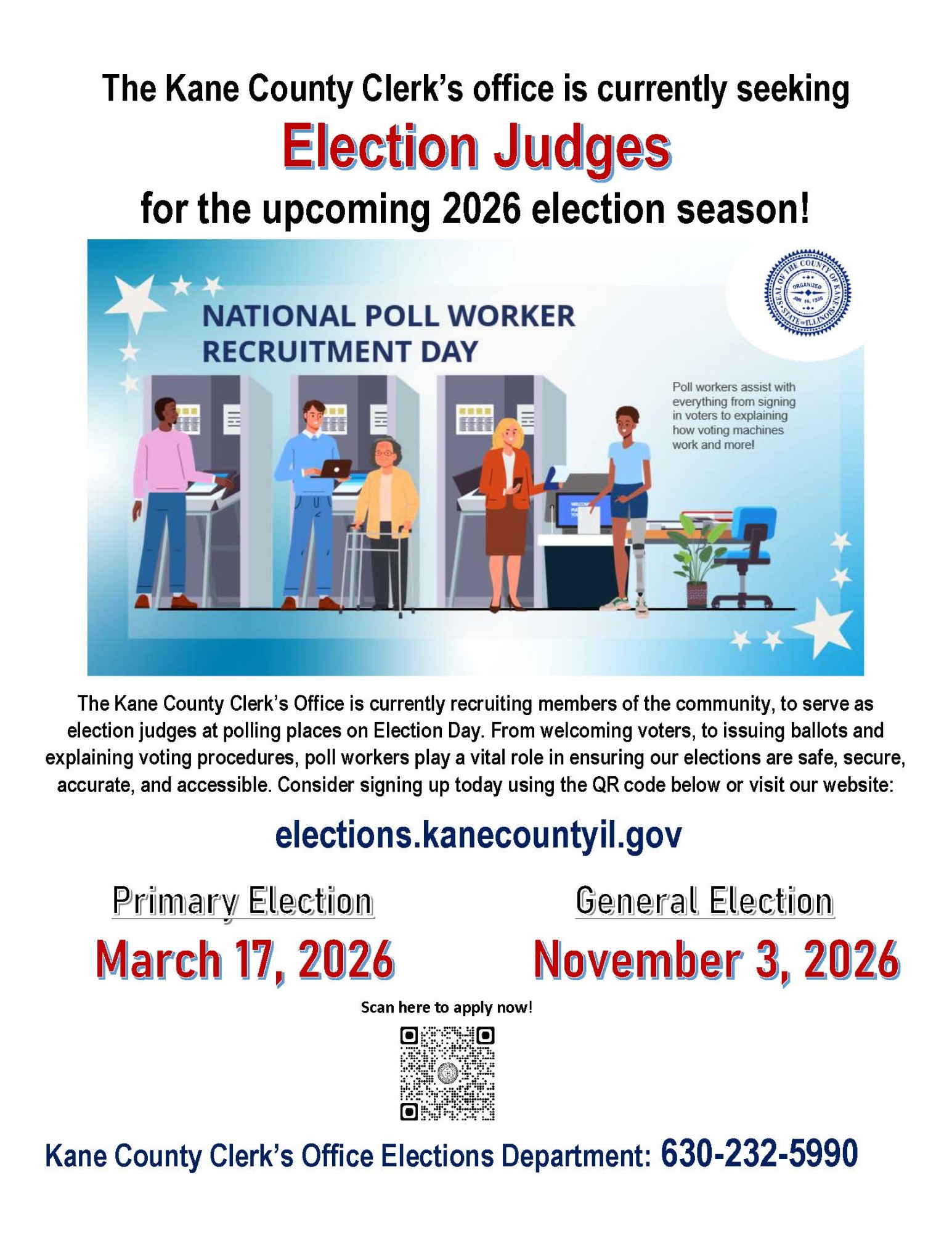 Support National Poll Worker Recruitment Day: The Kane County Clerk’s Office is now seeking community members to serve as election judges at polling locations on Election Day. Please sign up to be an election judge on the following Kane County website: https://clerk.kanecountyil.gov/Elections/