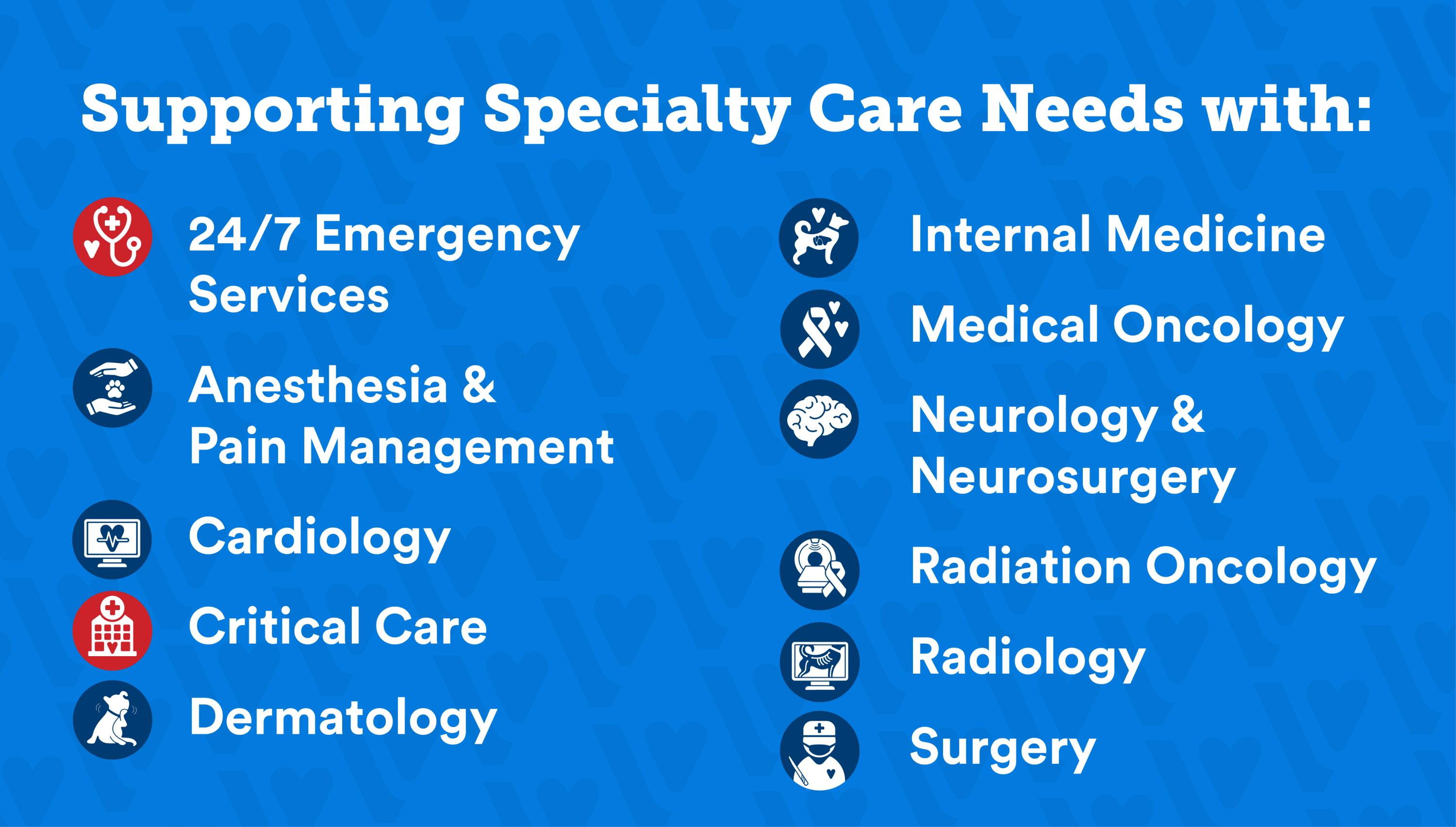Our expert emergency and critical care professionals will be there for you when you need us. Our level of care is maintained by the state-of-the-art diagnostic equipment and highly-trained staff used to treat your pet. Our specialty care services can be arranged as a referral from your pet’s primary veterinarian.