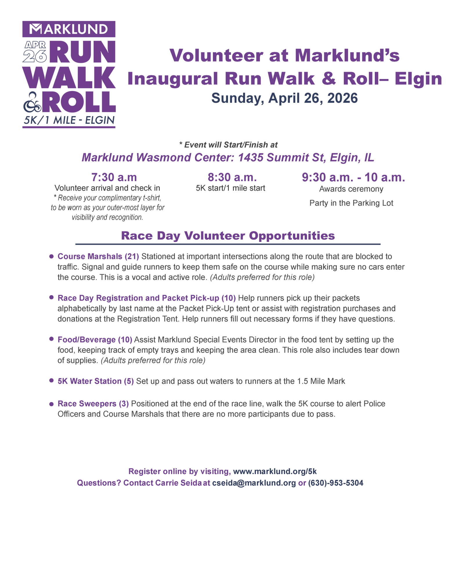Volunteer at Marklund’s Inaugural Run Walk & Roll– Elgin Back to Volunteer Opportunities Volunteer at Marklund’s Inaugural Run Walk & Roll– Elgin By Margarita Lesniewicz 3/26/2026 Images × Share × Email Facebook LinkedIn X Pinterest Powered By GrowthZone